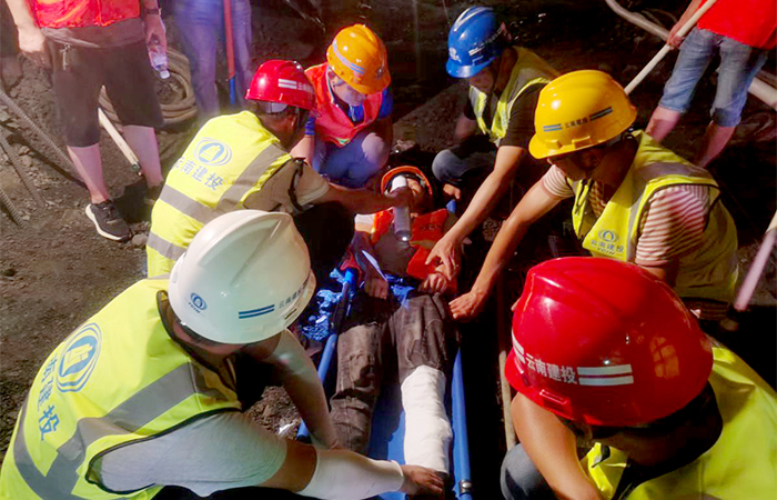 演練活動(dòng)前,項目部制定了詳細的《隧道坍塌應急救援演練方案》。演練根據模擬場(chǎng)景方案有序進(jìn)行:楊家灣隧道由于地質(zhì)缺陷導致工作面隧道坍塌,在現場(chǎng)管理人員的指揮下,4名工人快速安全撤出隧洞,但其中1名工人在撤離過(guò)程中被石塊砸中未能安全撤出。事故發(fā)生后,項目部立即啟動(dòng)突發(fā)事故應急救援預案實(shí)施救援。應急救援指揮部的各小組按照分工有條不紊地完成了傷員救治、物資搶險、事故調查等應急救援流程,整個(gè)演練過(guò)程緊張、有序、實(shí)操性強。