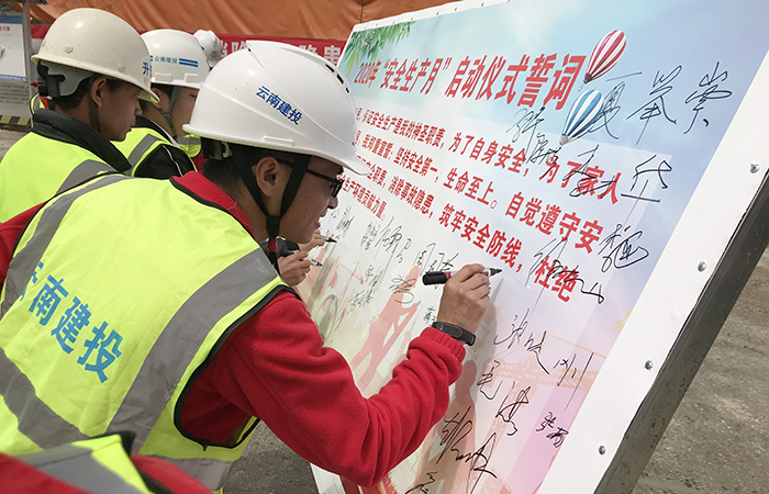 活動(dòng)對項目2019年度“先進(jìn)個(gè)人”和“安全衛士”受表彰的職工進(jìn)行了表彰獎勵,活動(dòng)中指出,項目要緊緊圍繞遂道、橋梁、高邊坡、深基坑、高空作業(yè)等一系列的安全隱患的工作點(diǎn),進(jìn)行安全排查,讓大家都重視安全,把事故消化在前期,抓好安全防范工作。所有參會(huì )人員在宣誓簽字墻上鄭重簽名承諾。