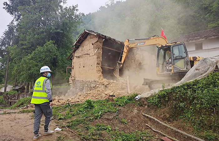 5月23日項目部根據集團指揮部的安排,將兩臺挖機分別派至小河社區和馬店村進(jìn)行后續危房拆除工作。項目部管理人員配合當地村委積極協(xié)調村民進(jìn)行危房拆除,為確保危房拆除工作安全有序推進(jìn),項目部安排每臺挖機配2名管理人員到現場(chǎng)進(jìn)行安全及秩序管理工作。