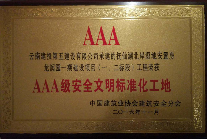 技術(shù)支持: 方森科技 11月29日,2016年中國建筑業(yè)協(xié)會(huì )建筑安全分會(huì )年會(huì )暨理事會(huì )在安徽合肥舉行,由第三直管項目部施工的撫仙湖北岸濕地安置房龍潤園一期建設項目(一、二標段)獲2016年“AAA級安全文明標準化工地”稱(chēng)號。