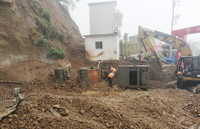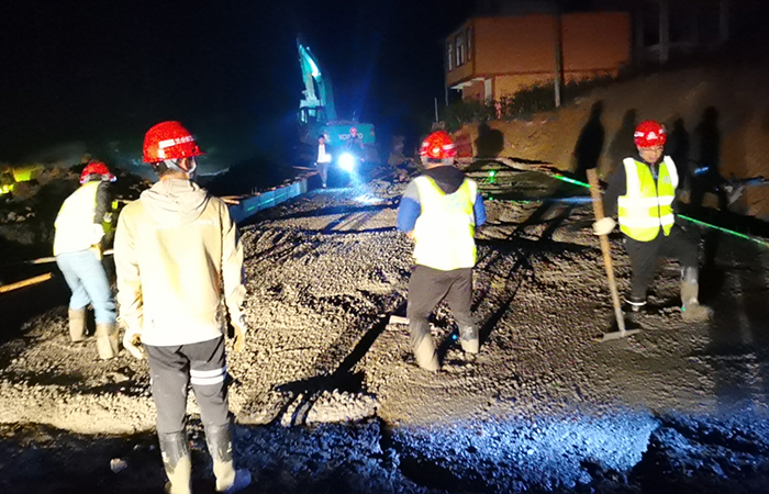 巧家三水廠(chǎng)項目“雙節”期間因巧家突降數十年未遇大暴雨,新龍洞及伍家溝進(jìn)場(chǎng)道路因塌方而受阻。項目班子團隊快速反應,將主要管理人員分為兩支隊伍,一支隊伍指揮夜以繼日搶修擋墻并快速清理泥石流;另一支隊伍緊鑼密鼓進(jìn)行隧道施工。經(jīng)過(guò)幾天日夜奮戰,項目完成道路清通的同時(shí)順利完成隧道開(kāi)挖支護70米。