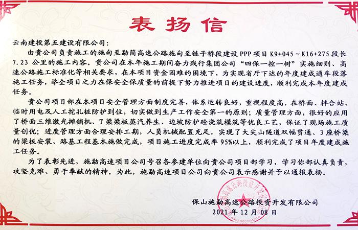 近期,施鏈高速二分部在施工期間連獲總承包二部“先進(jìn)單位 流動(dòng)紅旗”;施甸縣姚關(guān)鎮山邑村民委員會(huì )贈“搭建民心工程 接通天長(cháng)地久”錦旗;收到業(yè)主單位保山施勐高速公路投資開(kāi)發(fā)有限公司《表?yè)P信》等3個(gè)獎勵,項目工作得到了上級單位、地方單位的充分肯定。當前,施鏈高速二分部已進(jìn)入后期施工階段,在施工進(jìn)度方面大尖山隧道已貫通,達到移交驗收條件;路基工程的挖方、填方、擋土墻、邊坡防護、涵洞、平臺截水溝均已完成,水…